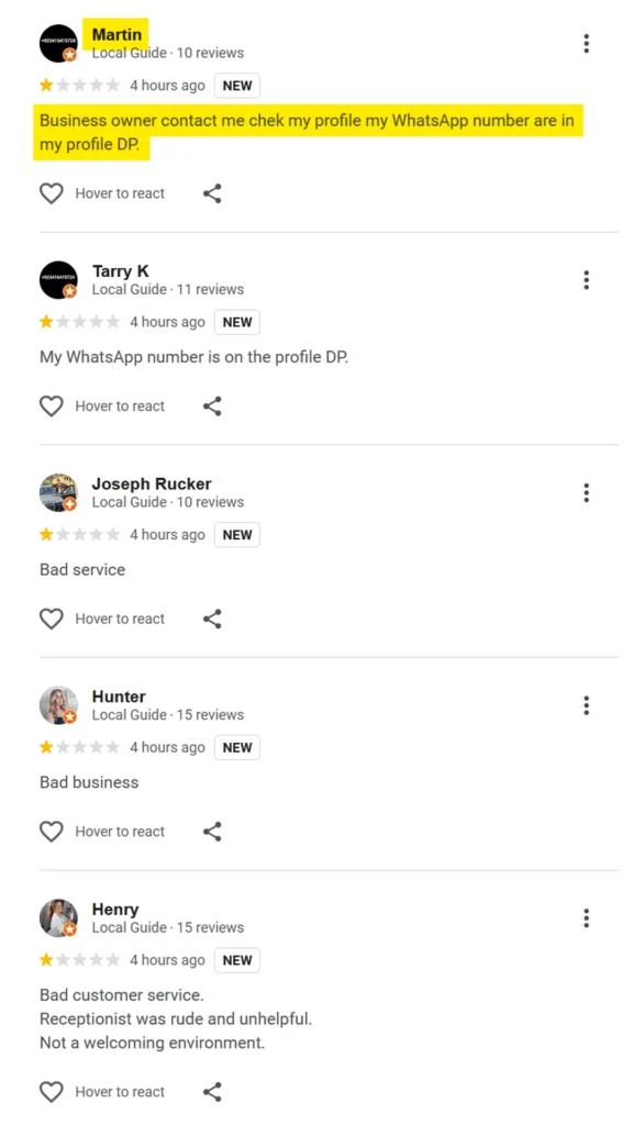 • One review even said: “Business owner, contact me, check my profile. My WhatsApp number is in my profile.”